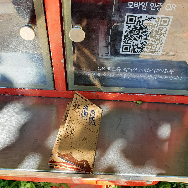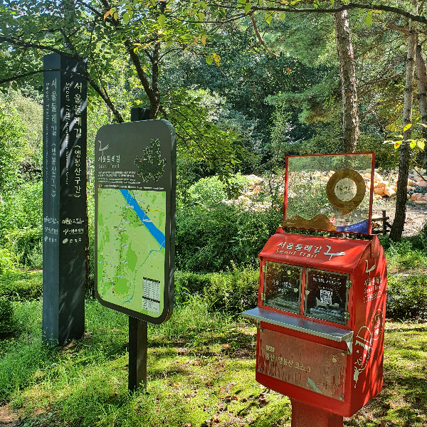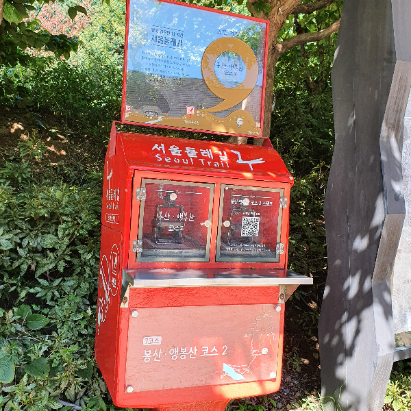 7-2코스는 6호선 증산역에서 시작한다. 증산역 3번 출구로 나와서 증산 체육공원 방면으로 들어가야 하는데, 증산 체육공원을 가는 길목부터 오르막길이다. 산 입구에 다다르자 빨간 우체통이 보였다. 본격적인 둘레길이 시작되기 전인데도 벌써 숨이 조금 차올랐다. 도장을 찍고 출발해 보았다.