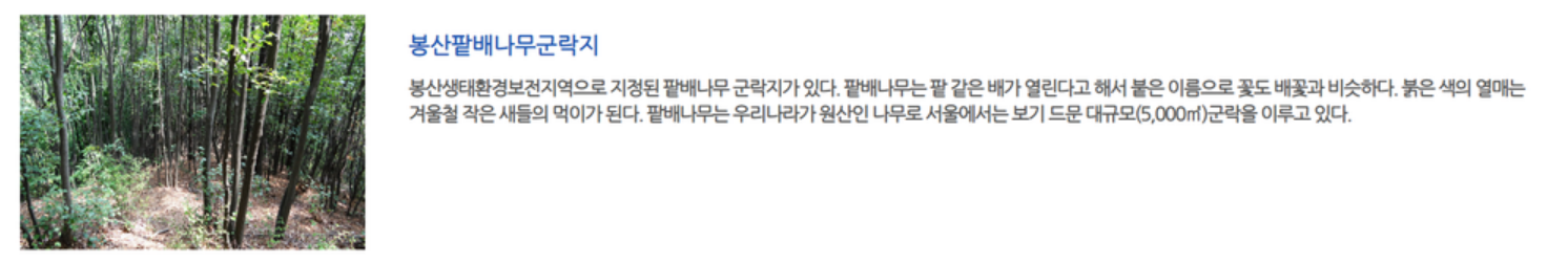 봉산에는 팥배나무 군락지와 편백나무 숲이 있다. 팥배나무 군락지는 봉산 생태환경보전 지역으로 지정되었는데, 서울에서 보기 드문 대규모 군락을 이루고 있다고 한다.